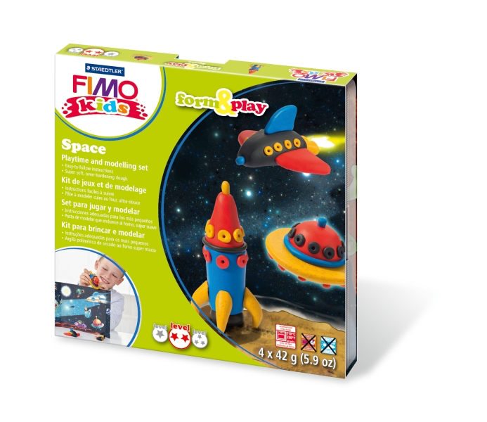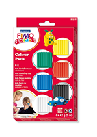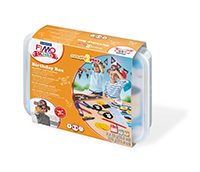 FIMO kids is available as individual color blocks, two color packs (six colors each) and two different product lines: "form&play" and "create&play". The individual blocks are available in 24 colors or two types of color packs ("basic" and "girlie") with six color blocks each. To create lasting toys, the FIMO kids can be baked in the oven at 230° for 30 minutes. Form & Play: One set contains for FIMO kids modeling clay blocks, a modeling stick, child-friendly modeling instructions and a playing background scene. A choice of 12 thematic worlds: Space, Dino, Robot, Knight, Princess, Pony, Fairy, Pet, Pirate, Seaworld, Monster, Mermaid. Three different levels of difficulty, from easy to challenging (1=easy, 2=medium, 3=difficult). Create & Play: For children with some experience in modeling. Available as two different sets to create jewelry or two types of birthday boxes (princess or pirate theme). The jewelry set contains four colorful blocks of oven-hardening clay, a modeling stick, ribbons, pearls and instructions. The birthday boxes each contain eight blocks of oven-hardening clay, six pirate hats or crowns, six modeling sticks, three wax crayons, three rubber bands and instructions. Available in three different degrees of difficulty (1=easy, 2=medium, 3=difficult). Easy to open, resealable packaging. FIMO kids is AP-certified by The Art and Creative Materials Institute, Inc. (ACMI) according to LHAMA and complies with the Consumer Product Safety Improvement Act (CPSIA) on the safety of toys. Tested for harmlessness every five years by independent toxicologists. Neutral smell. |